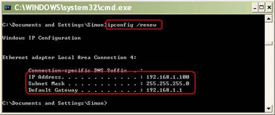 Type ipconfig /renew at the prompt window, press Enter, wait for a while, the DHCP server will assign a new IP address for your computer.